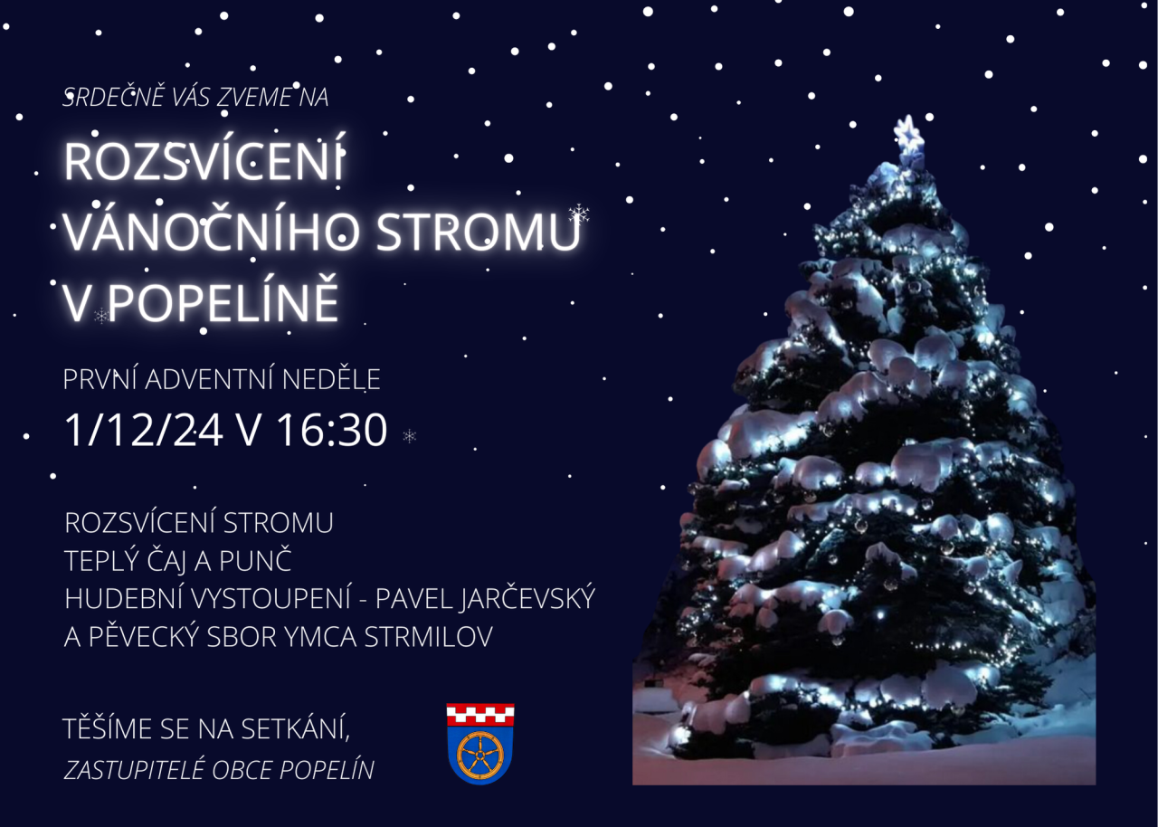Rozsvícení vánočního stromu v Popelíně se koná na první adventní neděli 1. prosince 2024 v 16:30. Návštěvníci si mohou vychutnat teplý čaj a punč, zatímco si užijí hudební vystoupení Pavla Jarčevského a pěveckého sboru YMCA Strmilov. Těšíme se na setkání se všemi!